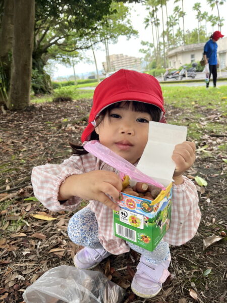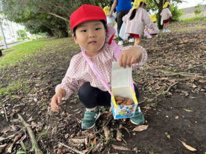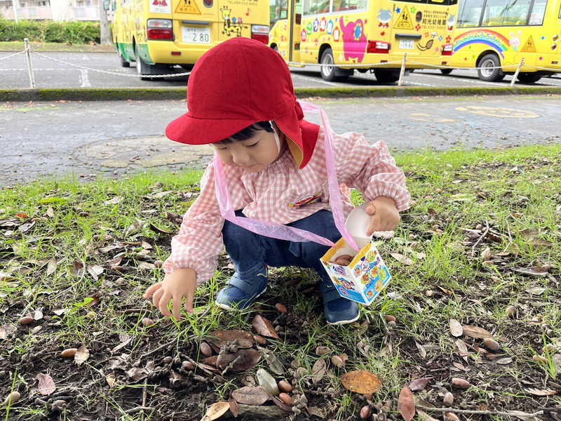 子どもたちは、落ちているどんぐりを見つけ、とても嬉しそうに笑顔を浮かべていました(^^)