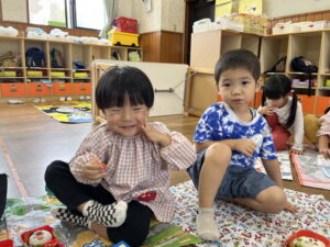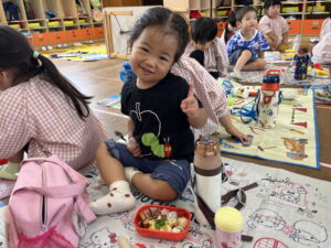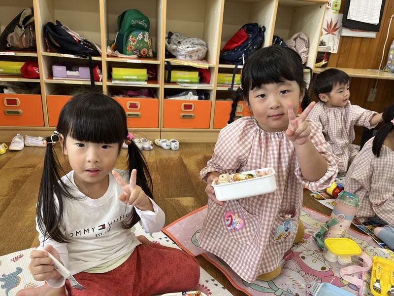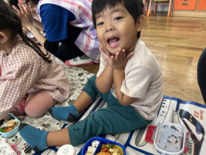 保育室にシートを広げ、友達と楽しくお弁当を食べることができました!