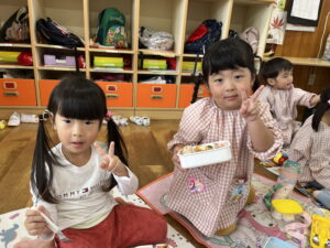 どんぐりを園に持って帰り、子どもたちが楽しみにしていたお弁当の時間です。