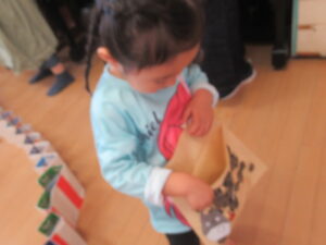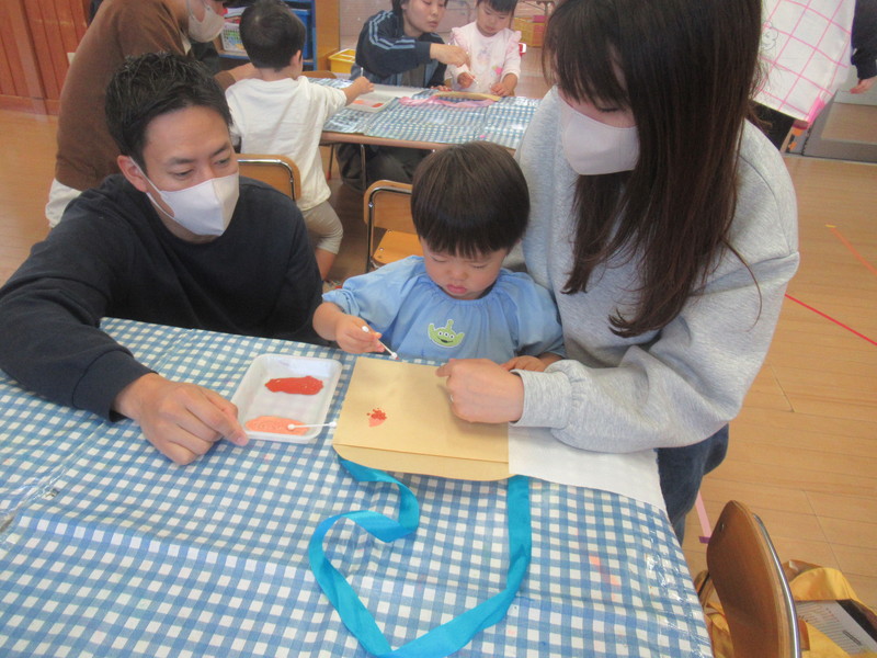 絵の具を使っての活動で、まっくろくろすけをスタンプしたり、綿棒でどんぐりを描いたり、折り紙で作ったトトロを貼ったりして、オリジナルの可愛いバッグを作りました👜