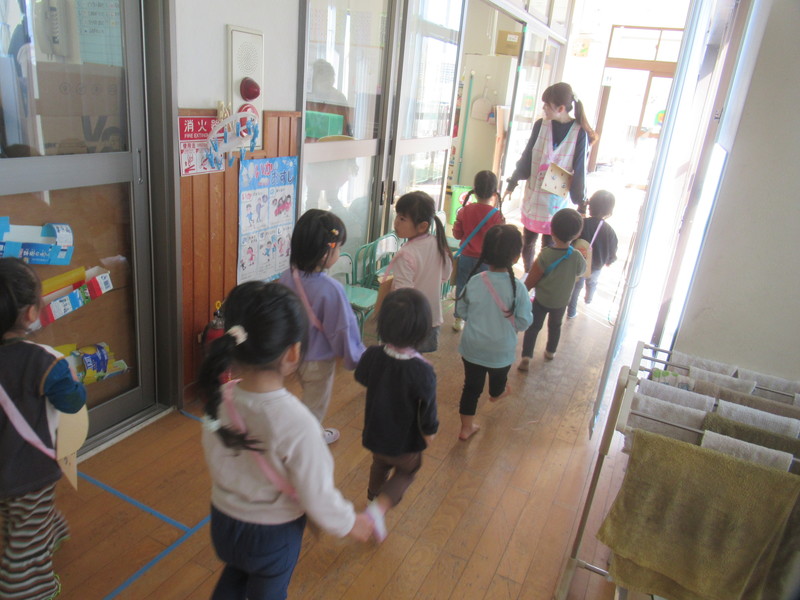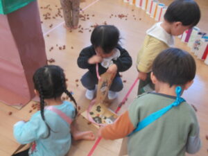 その後は、作ったバッグをもってどんぐり拾いに!!『出発進行〜!』の掛け声で、みんなでお出掛け気分を味わいながら、どんぐり広場でたくさんのどんぐりを拾いました★