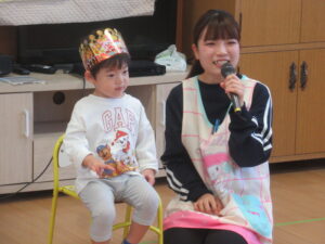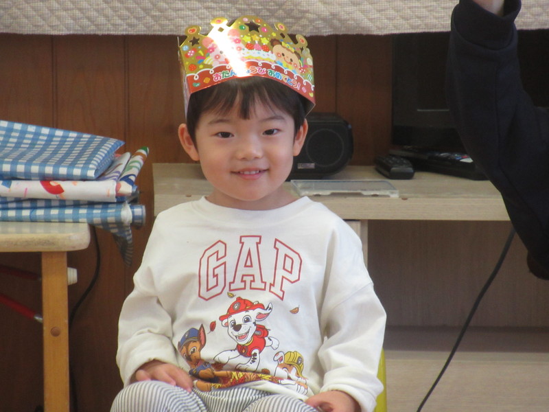 後半は、11月・12月生まれのお友達をお祝いする「誕生会」もあり、自分の名前や好きな食べ物を上手に応えてくれました💛
