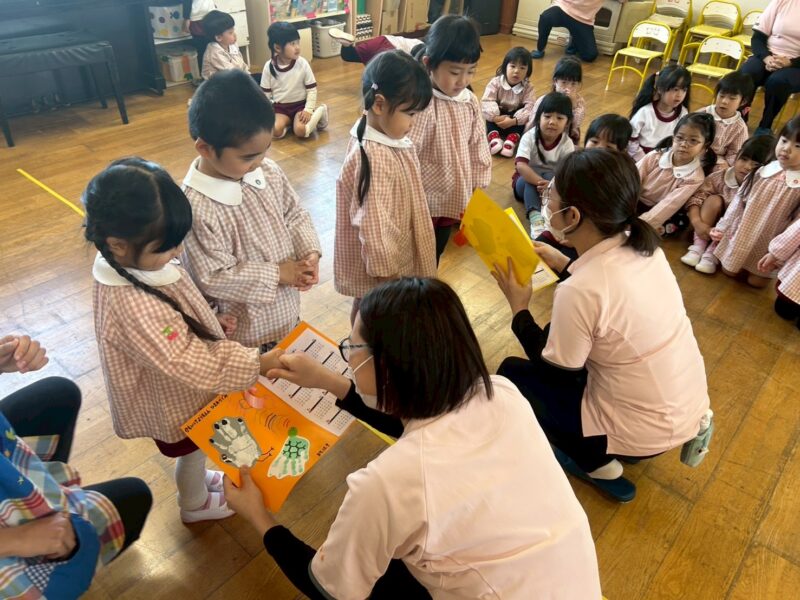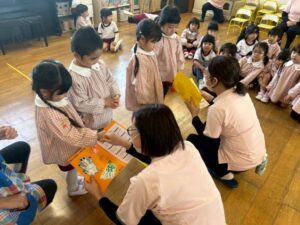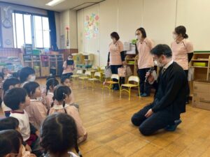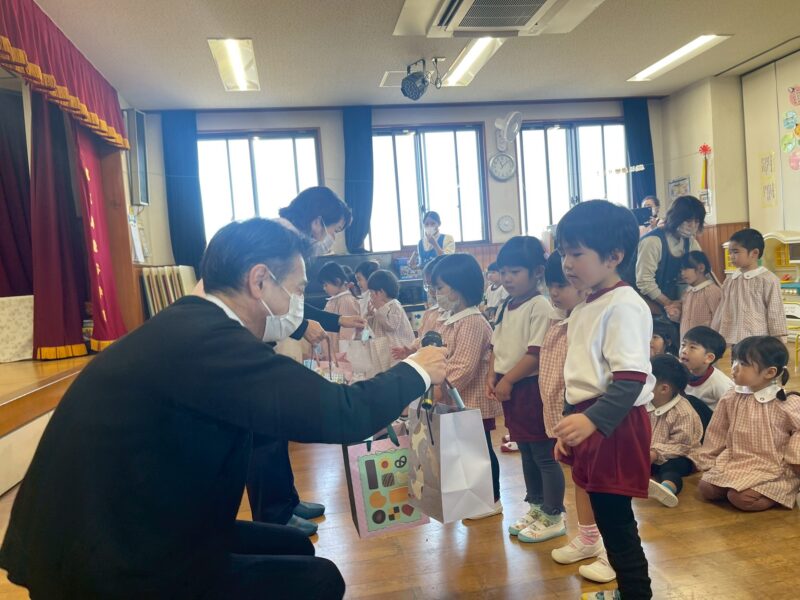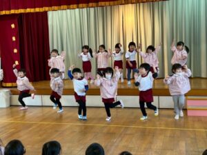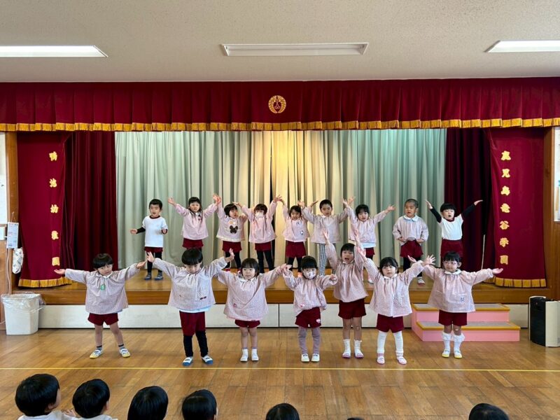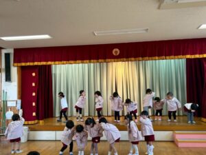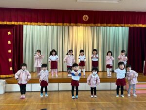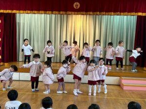 かもいけギャラリー かもいけギャラリー 花水木さんとの交流会(年少) 2025年12月18日 12月9日(火)に「特別養護老人ホーム・花水木」との交流を行いました。 インフルエンザの流行により、花水木の職員の方が鴨池幼稚園に訪問してくださりました。 子どもたちは、発表会の遊戯を踊ったり、うたを歌ったりしました。 舞台の上で、笑顔で元気いっぱいの発表ができました。 花水木さんから子どもたちへプレゼントもいただきました。大喜びな子どもたちでした。ありがとうございました!