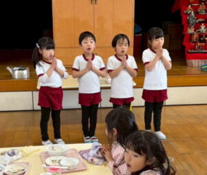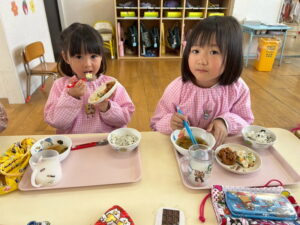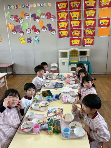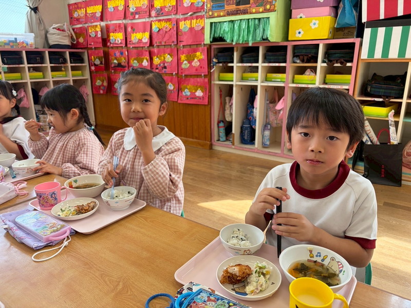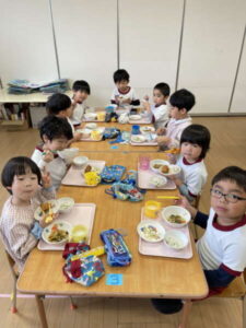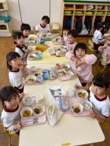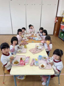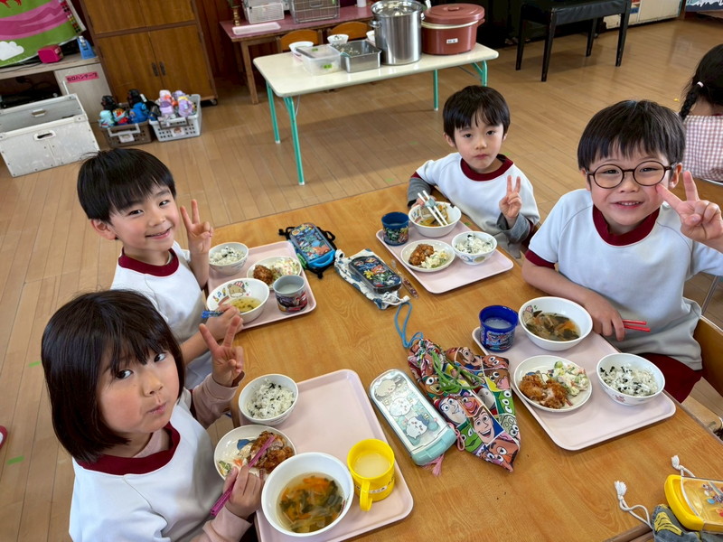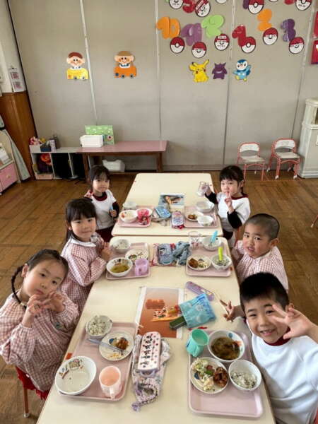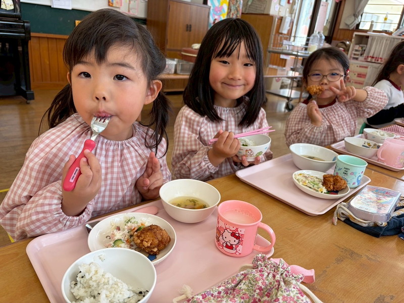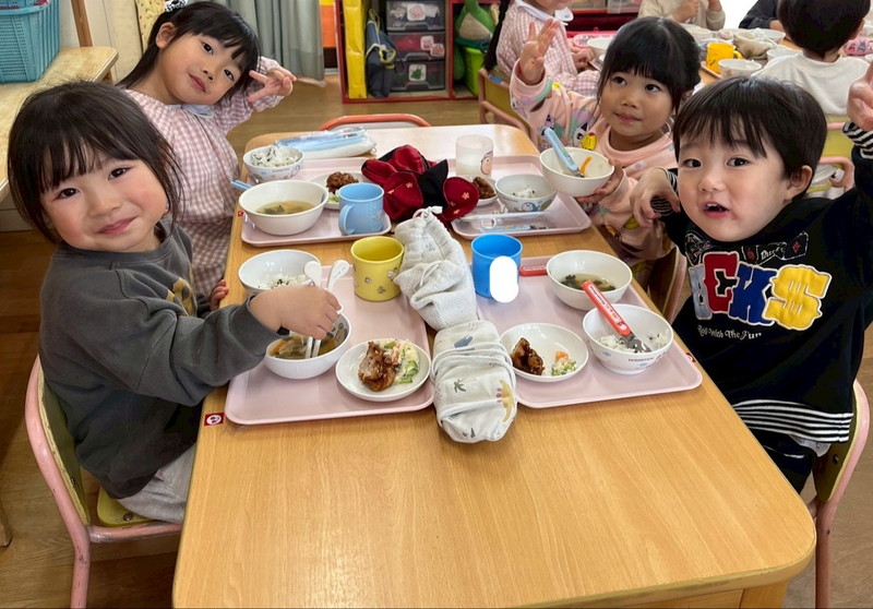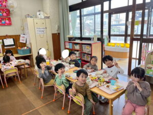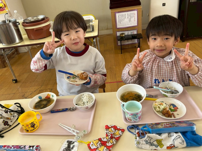 ちょっぴり恥ずかしくて大人しくなってしまう子、元気いっぱい楽しむ子、とそれぞれの姿が可愛かったです。給食も子どもたちのリクエスト給食のメニューで、カルピスもあり、大喜びでした!年度末に良い異年齢交流の活動ができ、楽しかったです♡