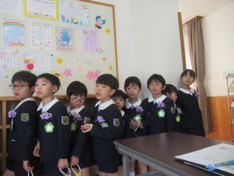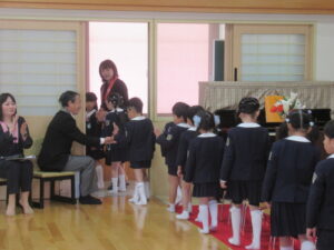 卒園証書授与では、一人一人立派な姿で返事とお礼を言い、園長先生から卒園証書をいただくことができました。