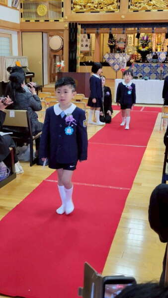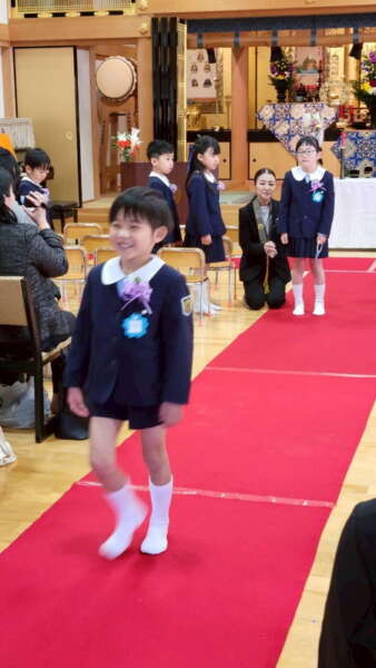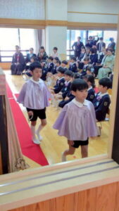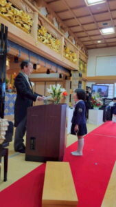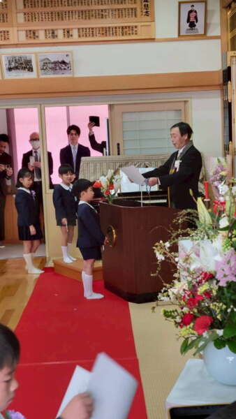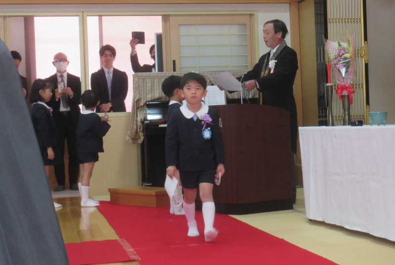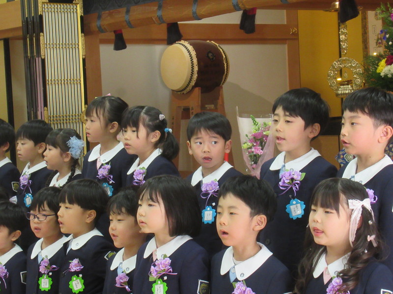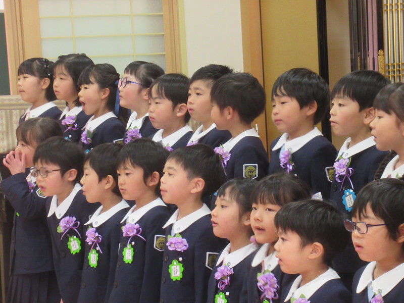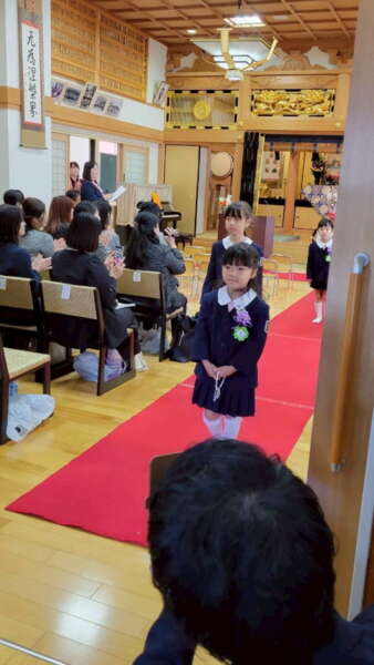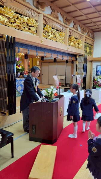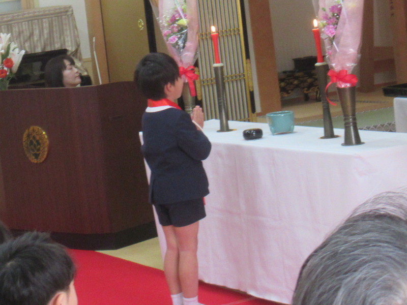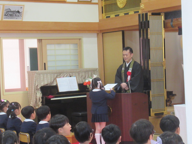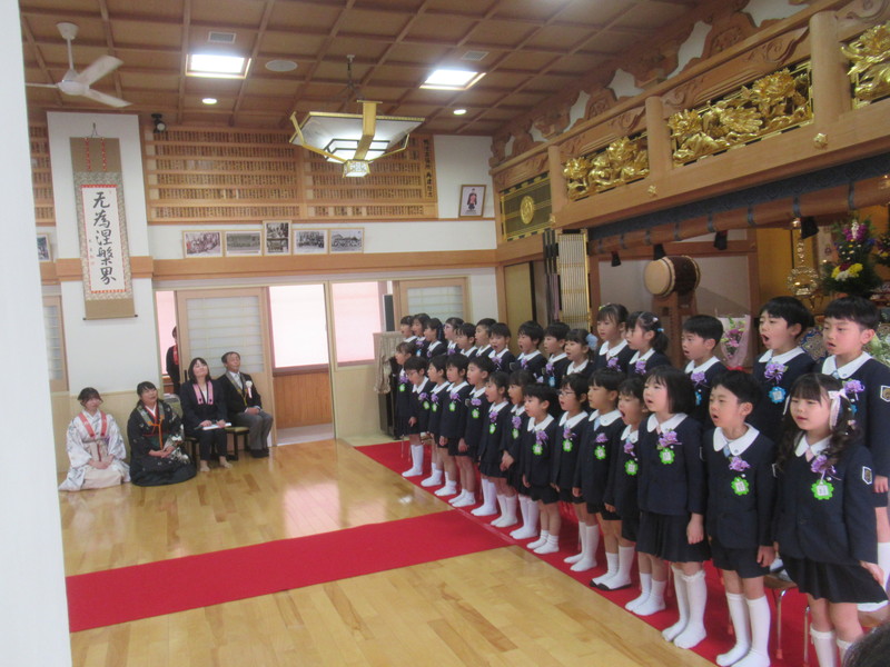 本堂では、たくさんの保護者の皆様と、来賓・園の先生方が拍手で迎えてくださり、式の間もあたたかく見守ってくださいました。仏参では、代表の子どもたちが立派に頑張ってくれました。