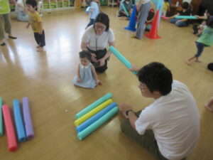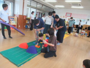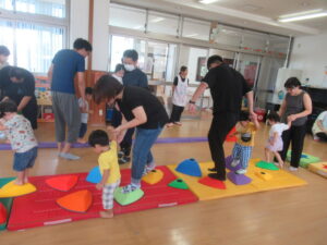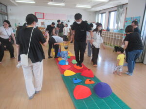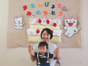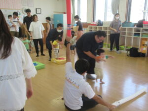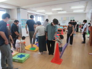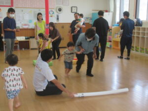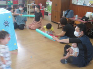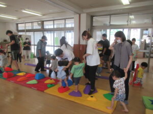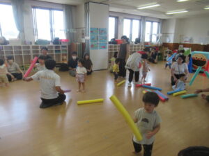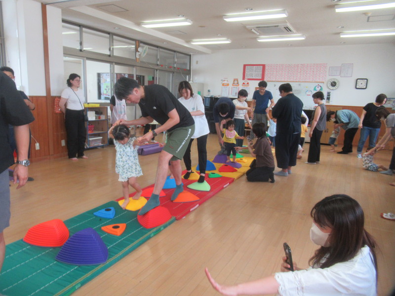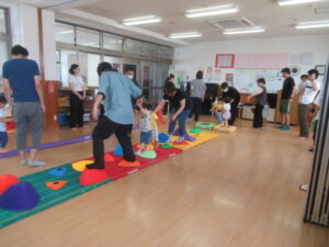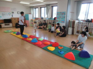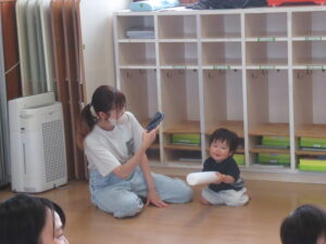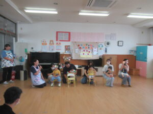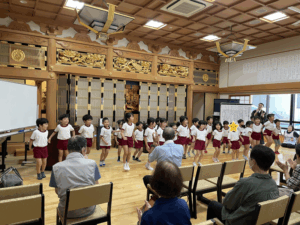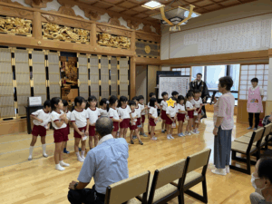 初めに、「とんぼのめがね」の歌と、運動会でする「ディズニー体操」を踊りました。お寺の方々の熱い声援と拍手がたくさんあり、子どもたちの緊張も吹き飛び、元気いっぱい発表することができました♪