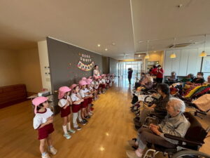 子どもたちは、「大きな栗の木の下で」「げんこつやまのたぬきさん」の歌を歌ったり、「ディズニー体操」を踊ったり言葉のプレゼントを行いました。元気いっぱいの子どもたちの姿を見て、花水木の方々も喜んで下さっていたと思います✨花水木の方の中には、100歳の方もいらっしゃることを聞いてびっくりする子どもたちでした。