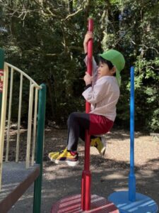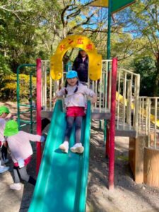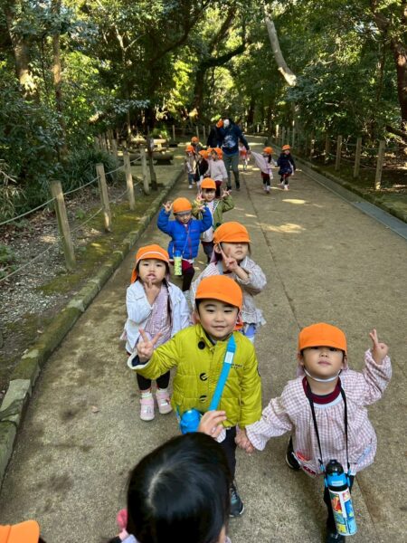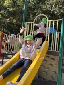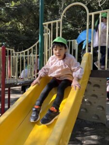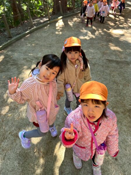 登っていく途中ですれ違った方々に元気よく「こんにちは!」と挨拶をしたり、木々の間から覗くを見上げて「きれいだね~」と話をしたりして、