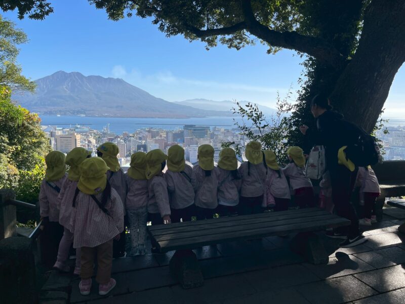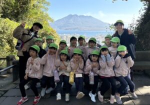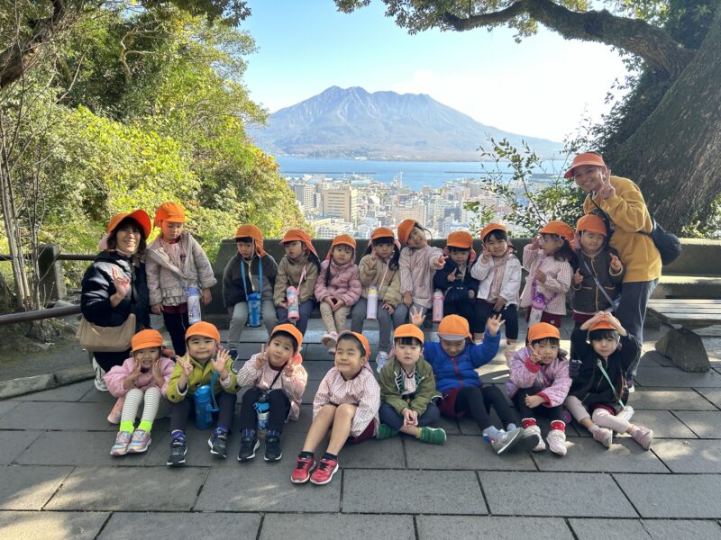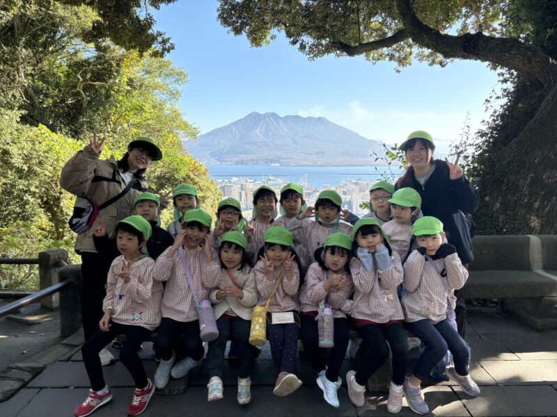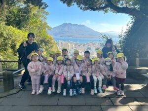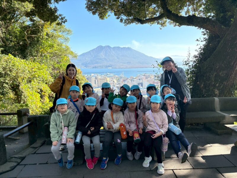 頂上では、桜島が大きく見え皆で写真を撮りました!登り切ったことに満足感や達成感を感じていました。