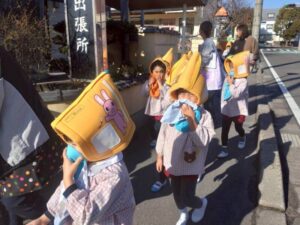 子どもたちは、避難をするよう放送が聞こえると落ち着いて防災頭巾を被り